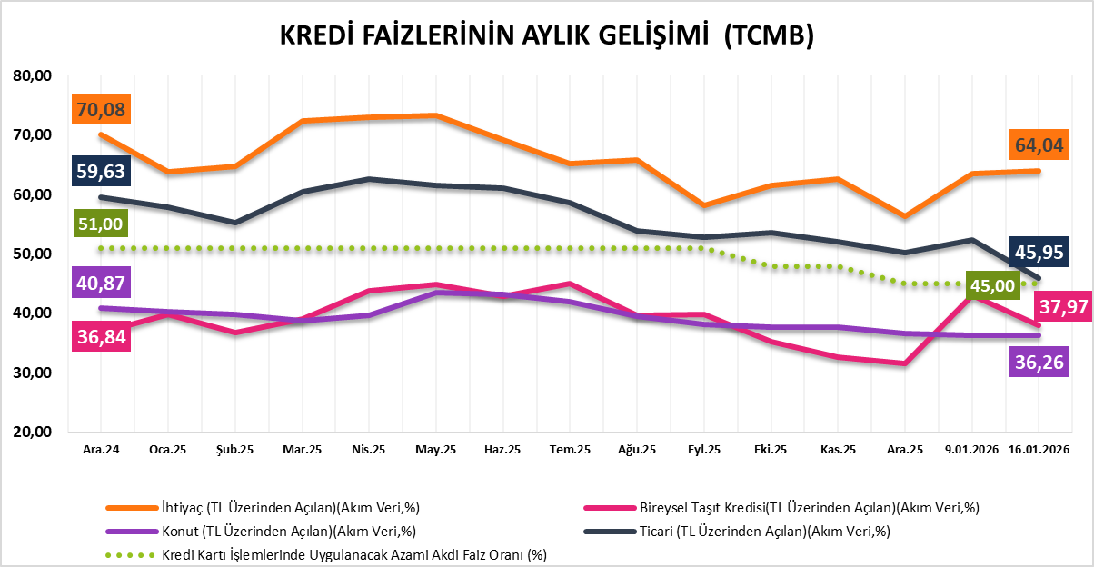 - TCMB verilerine göre, kredi nevilerine göre faizler yeni yılın ilk haftasında 3 puan civarında yükseliş kaydettikten sonra, ikinci haftasında yılsonu seviyelerine indi.