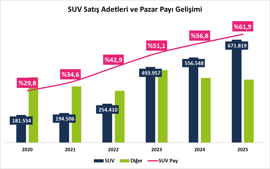 2. SUV araç etkisi: SUV satışları, son 3 yılda %264 artışla 671.819’a yükselerek Toplam Pazar payı %61,9’a yükselmiştir. Buradaki gelişimde özellikle Çinli markaların pazara düşük fiyatlarla girmelerinin etkisi yüksek olmuştur.
