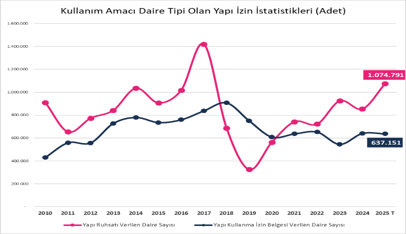 Yapı Kullanım İzinlerinin 2020 yılından bu yana paralel bir seyir izlediği; 2024 yılında daralma gösterdikten sonra 2025 yılında tekrar yatay seviyeye ulaştığı görülmektedir. Yani konut arzı yükselmezken, konut satışları artmakta, bu da fiyatlara yükseliş olarak yansımaktadır.