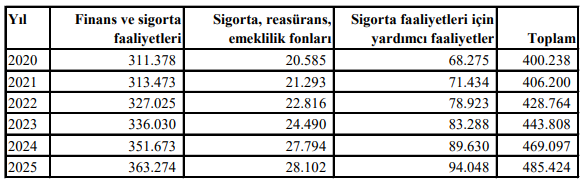 2025 yılında bir önceki yılla mukayese edildiğinde finans ve sigortada çalışan sayısı yüzde 3,48 arttı. Buna göre bir önceki yılla mukayese edildiğinde finans ve sigortada çalışan sayısı 11.601 artarken, sigorta, reasürans ve emeklilik fonlarında çalışan sayısı 308, sigorta faaliyetleri için yardımcı faaliyetlerde çalışanların sayısı ise 4.418 kişi arttı.