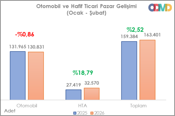 2026 yılı Ocak-Şubat döneminde otomobil ve hafif ticari araç pazarı yüzde 2,52 oranında arttı. Otomobil satışları, 2026 yılı Ocak-Şubat döneminde geçen yıla göre yüzde 0,86 oranında daralarak 130 bin 831 adet, hafif ticari araç pazarı ise yüzde 18,79 artarak 32 bin 570 adet oldu.