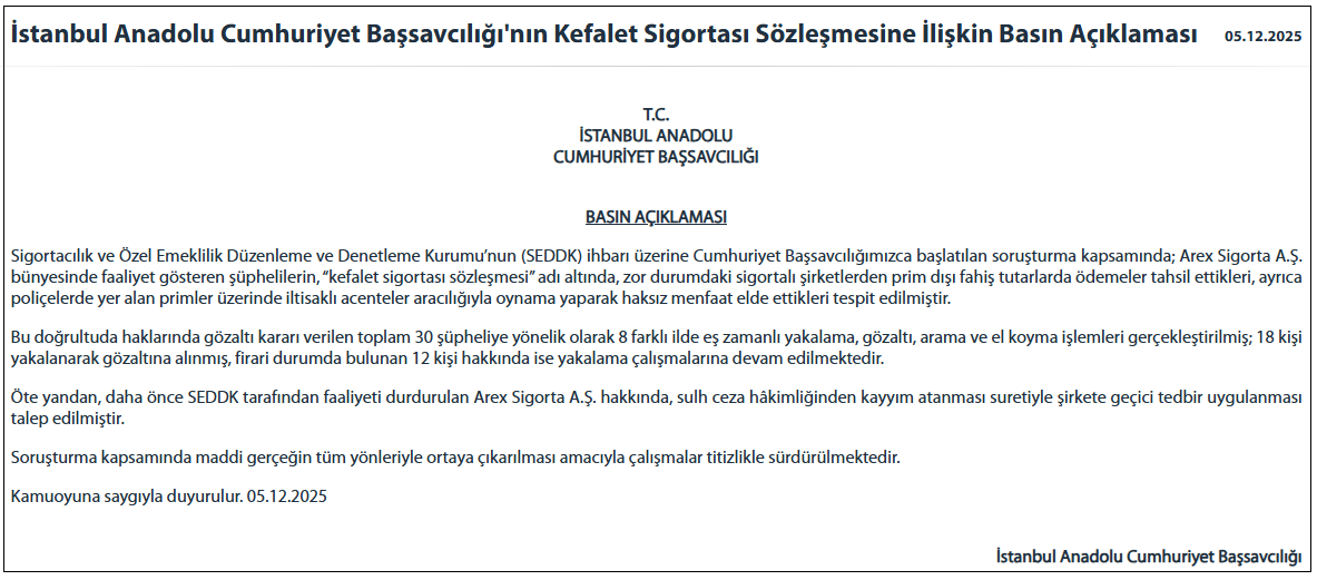 “Öte yandan, daha önce SEDDK tarafından faaliyeti durdurulan Arex Sigorta A.Ş. hakkında, sulh ceza hâkimliğinden kayyım atanması suretiyle şirkete geçici tedbir uygulanması talep edilmiştir. Soruşturma kapsamında maddi gerçeğin tüm yönleriyle ortaya çıkarılması amacıyla çalışmalar titizlikle sürdürülmektedir.”