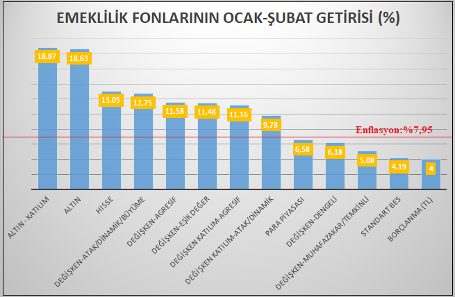 Şubat ayında 20 emeklilik fonunun sadece ikisi (altın fonları) enflasyonun üzerinde getiri sağlarken, 18 emeklilik fonunun getirisi enflasyon altında kaldı.