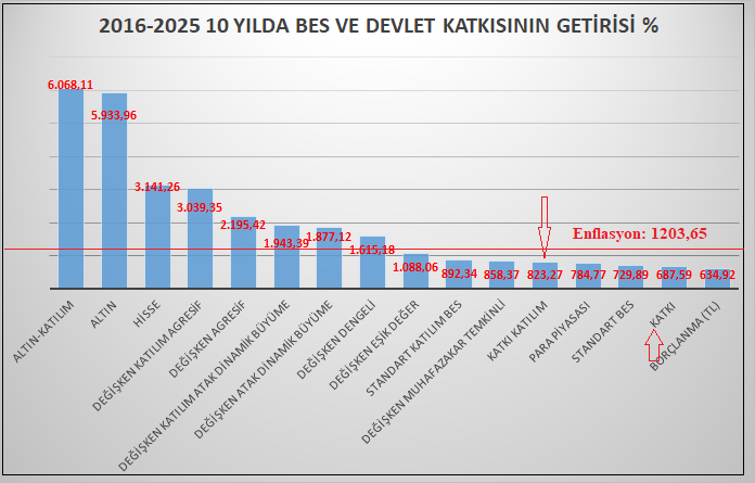 EGM verilerine göre son 10 yılda enflasyon yüzde 1203,65 olurken, devlet katkısı fonunun (katkı fonu); katkı katılım fonu yüzde 823,3 getiri sunarken, katkı fonu ise yüzde 687,6 getiri sunmuş. Yani, katkı katılım fonu enflasyonun 380 puan, katkı fonu da enflasyonun 516 puan altında getiri sunmuş. Daha açık bir anlatımla katılımcıların devlet katkısındaki birikimleri son 10 yılda enflasyon karşısında erimiş.