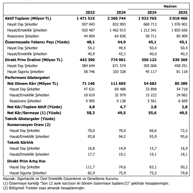 “Bu çerçevede, Haziran 2025 itibarıyla toplam özsermaye açısından yabancı sermayenin payı yüzde 45 olarak gerçekleşmiştir. Söz konusu dönemde uluslararası sermayenin toplam prim üretimindeki payı yüzde 50 olmuştur. Sektörde faaliyet gösteren 71 şirketin 36’sında yabancı ortakların payı yüzde 50’nin üzerinde bulunmakta olup uluslararası sermayeye sahip şirket sayısı 44’tür.”