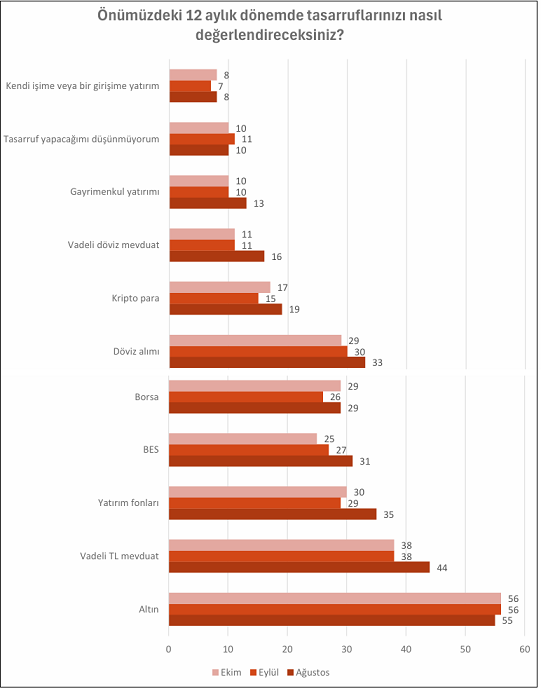 Ekim ayında tasarruf tercihinde ilk sırayı yüzde 56 ile altın alırken, ikinci sırayı yüzde 38 ile vadeli TL mevduatı, 3. sırayı da yüzde 30 ile yatırım fonları aldı. Yüzde 29 ile 4. sırada borsa ile yine yüzde 29 ile döviz aldı. BES ise yüzde 25 ile 6. sırada geldi.