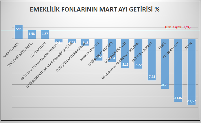 Uzun süredir BES katılımcılarına ciddi getiriler sunan altın fonları ise Mart ayında yüzde 11’lerde negatif getiri sundu. Enflasyonla mukayese edildiğinde altın fonunun getirisi yüzde -13’e kadar çıktı. Benzer şekilde, hisse fonları da mart ayında yüzde 8,7 negatif getiri sundu, reel olarak getiri yüzde -10’u geçti. Değişken fonların tamamının getirisi enflasyonun çok altında kalırken, borçlanma fonları da benzer şekilde yüzde 3,8 negatif getiri sağladı. Mart ayında birikimlerini para piyasası fonlarının dışındaki fonlarda değerlendirenlerin tasarrufları eridi.