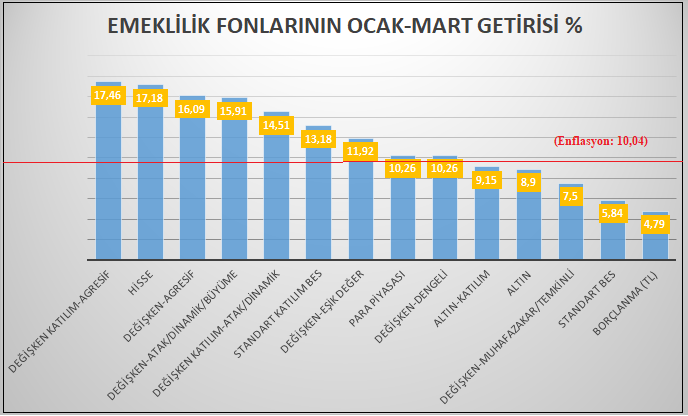 Sene başından bu yana kıyas grupları içinde yer alan 20 emeklilik fonunun 12’si enflasyonun üzerinde getiri sağladı. Ocak-Mart döneminde para piyasası fonları yüzde 10,3 ile enflasyonun çok az altında getiri sağlarken, altın fonları ise yüzde 8,9 negatif getiri sundu.