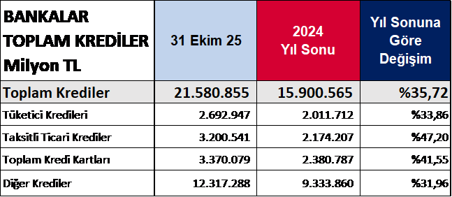 2025 Yılı 10 Aylık Kredi Hacmi Büyümeleri incelendiğinde;