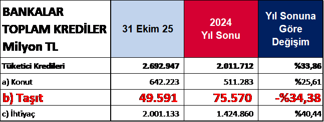 - Bireysel taşıt kredileri, 2024 yılsonuna göre -%34,38 daralma ile son 2 yıldaki gerilemesini sürdürerek, 104 Milyar TL’den 50 Milyar TL’nin altına indi.