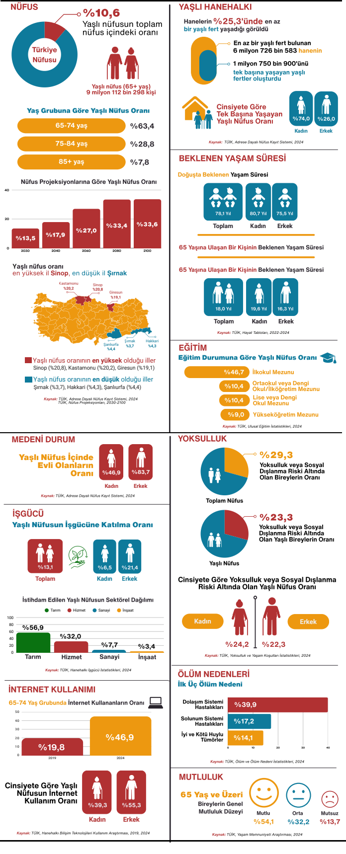 TÜİK, 1 Ekim Dünya Yaşlılar Gününde, Türkiye’deki yaşlıların durumunu infografik ile açıkladı. Buna göre, 2024 yılında, toplam nüfus içinde yaşlı nüfusun oranı yüzde 10,6 oldu. 65 yaş üzeri nüfusun toplam sayısı ise 9.1 milyon olarak gerçekleşti. Yaşlı nüfus içinde 65-74 yaş grubunun oranı yüzde 63,4 oldu. TÜİK araştırmasına göre hanelerin yüzde 25,3’ünde en az bir yaşlı fert yaşıyor. En az bir yaşlı fert bulunan hane sayısı 6.7 milyon. 1.7 milyon yaşlı ise tek başına yaşıyor. Yaşlı nüfusun en yüksek olduğu il Sinop’ken, en düşük olduğu il ise Şırnak oldu. Yaşlı nüfusun işgücüne katılma oranı ise yüzde 13,1 olarak gerçekleşti.