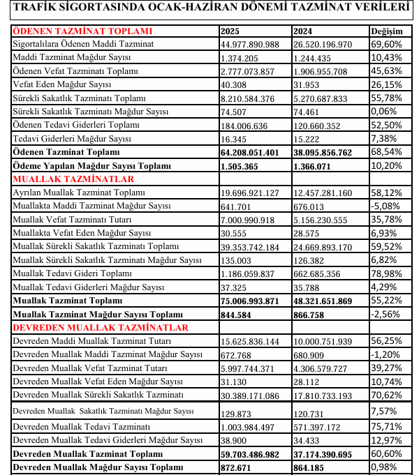 Mağdur sayısı ise 2024’ün ilk yarısında 864 bin 185 kişi iken, bu yılın aynı döneminde bu sayı yüzde 0,98 artarak, 872 bin 671’e yükseldi. Devreden muallak tazminatta da benzer durum yaşandı; mağdur sayısı neredeyse artmazken, tazminat tutarı yüzde 60’ın üzerinde arttı.