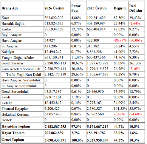 2026’nın ilk ayında en çok üretimin gerçekleştiği branş ise genel zararlar branşı oldu. Bu branşta katılım şirketleri 2.2 milyar TL prim üreterek, geçen yılın aynı dönemine göre üretimlerini yüzde 65,09 artırdı.