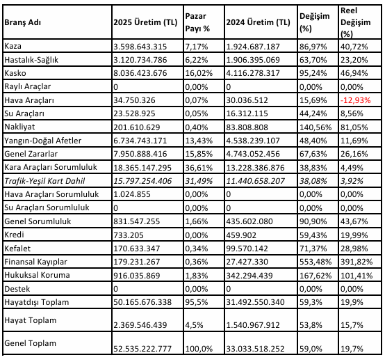 Katılım sigorta şirketleri branş bazında incelendiğinde ise pazarın trafik ve kasko ağırlıklı büyüdüğü görüldü. 2025’in Ocak-Eylül döneminde katılım sigorta şirketleri 15.7 milyar TL trafik primi üreterek, geçen yılın aynı dönemine göre trafikte primlerini yüzde 38,08 artırdı.
