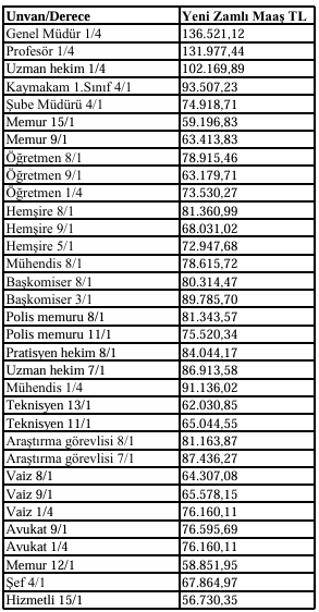 Yeni zamla birlikte; genel müdürün (1/4) maaşı 136.520 TL, öğretmenin (9/1) maaşı 63.179 TL lira, polis memurunun (8/1) maaşı 81.343 TL, olacak.