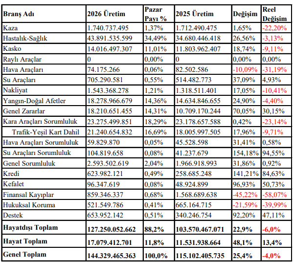 Branş bazında incelendiğinde 2026’nın ilk ayında en çok prim üretiminin gerçekleştiği branş sağlık sigortaları oldu. Şirketler, sağlıkta 43.8 milyar TL prim üreterek, geçen yılın aynı dönemine göre üretimlerini yüzde 26,55 artırdı. Enflasyonla mukayese edildiğinde ise sağlık pazarı geçen seneye göre yüzde 3,13 reel küçüldü.