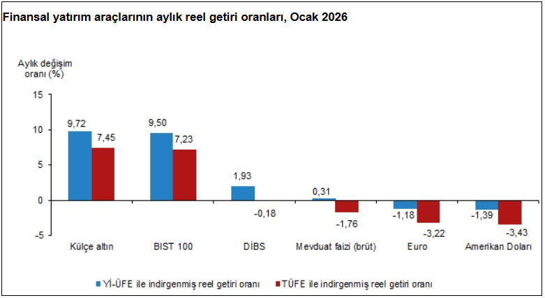 TÜİK, 2026 Ocak ayı finansal yatırım araçlarının reel getiri oranlarını açıkladı. Aylık en yüksek reel getiri, TÜFE ile indirgendiğinde %7,45 oranlarıyla külçe altında gerçekleşti.