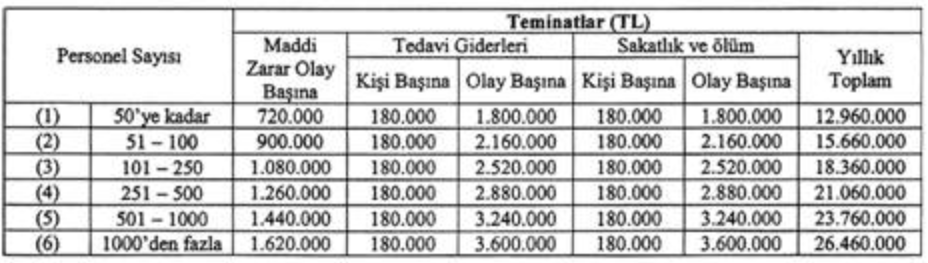 Buna göre personel sayısı 50’ye kadar olan işletmelerde teminat tutarı maddi 720 bin TL’ye, sakatlık ve ölüm teminatı da kişi başına 180 bin liraya çıkarıldı. 50-100 personeli olan işletmelerde ise maddi teminat 900 bin lira, sakatlık ve ölüm teminatı kişi başına 180 bin lira olarak belirlendi. Personel sayısı 1000’den fazla olan işletmeler içinse maddi teminat tutarı 1 milyon 620 bin liraya, sakatlık ve vefat tazminatı a kişi başına 180 bin liraya, olay başına da 3.6 milyon liraya yükseltildi.