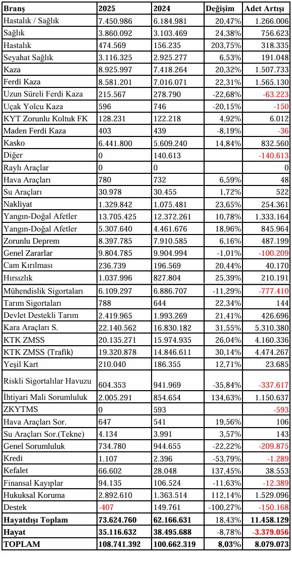 Şirketler, 2024’ün aynı döneminde ise 62.1 milyonu hayat dışı, 38.4 milyonu hayat olmak üzere toplam 100.6 milyon adet poliçe üretmişti. Geçen yıl ile mukayese edildiğinde 8 milyonun üzerinde poliçe üretim artışı gerçekleştirildi. Bu da yüzde 8’lik poliçe artışı anlamına geliyor. Buna göre, hayat dışı sigortalar geçen yılın aynı dönemine göre 11.4 milyon adet artarken, hayat sigortasında ise 3.3 milyon adet düşüş gözlendi.