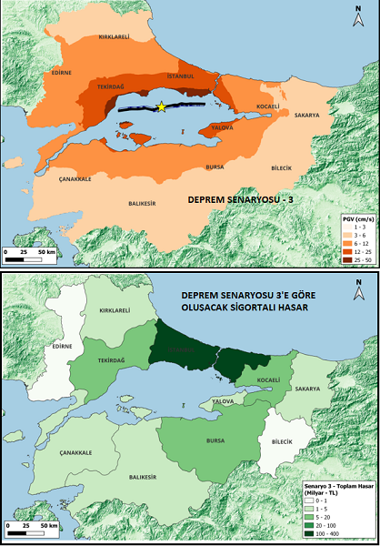 “Tüm sigorta şirketleri ile çalıştık, bunların stres testisini yaptık. Marmara için toplam kümül 11,5 trilyon TL. Toplam sigorta bedeli 11,5 trilyon TL. Bu rakam 2024 sonu rakamı. Bunun içinde şirketlerin kendi korumaları ve trete devirleri var. Burada en büyük kümül, İstanbul’da. Daha sonra, Kocaeli ve Bursa geliyor; arkasından Tekirdağ geliyor. Tekirdağ’dan sonra Sakarya, Balıkesir, Çanakkale, Kırıkkale, Bilecik, Yolova, Edirne’deki kümül toplamları çok çok daha düşük bu anlamda. Bunları sonunda da 380 ila 500 milyar TL arasında değişen bir sigorta hasarı oluşacağını hesapladık. Bunun içinde DASK yok. Bu da yaklaşık, 2024 sonu kuruyla 14 milyar dolar civarında bir ortalama hasar görülüyor.”