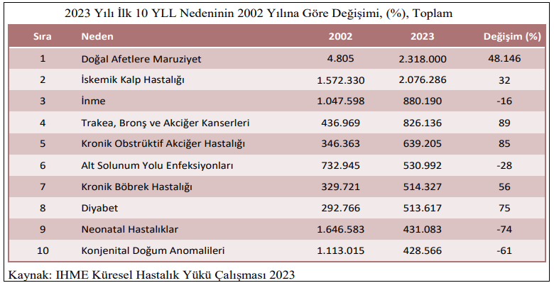 Sağlık Bakanlığı, yayınladığı, 2024 Yılı Sağlık İstatistik Yıllığında, erken ölüm sebebiyle kaybedilen yaşam yılını ((YLL) açıkladı. İstatistiklere göre, 2023 yılında, 2 milyon 318 bin kişi doğal afetler nedeniyle hayatını kaybetti.