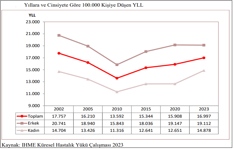 Sağlık Bakanlığı, yayınladığı, 2024 Yılı Sağlık İstatistik Yıllığında, erken ölüm sebebiyle kaybedilen yaşam yılını ((YLL) açıkladı. İstatistiklere göre, 100 bin kişiye düşen YLL sayısı, 2023 yılında 16.667 kişi oldu. Yani, 2023 yılında, 100 bin kişiden 16 bin 667’si, erken ölüm sebebiyle yaşam yılı kaybı yaşadı. 2020 yılında bu sayı 15.908 kişiydi.