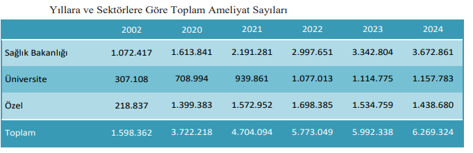 - 2024 yılında toplam 6.2 milyon ameliyat gerçekleşti. 2023 yılıyla mukayese edildiğinde ameliyat sayısı 276 bin 986 arttı. Ameliyatların 3.6 milyonu kamu hastanelerinde, 1.1 milyonu üniversite hastanelerinde gerçekleşirken; 2023 yılında özel hastanelerde gerçekleşen ameliyat sayısı 1.5 milyondan 2024 yılında 1.4 milyona geriledi.