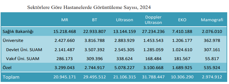 - 2024 yılında 116.6 milyon görüntüleme yapıldı. Bunun 31.7 milyonu doppler ultrason, 29.4 milyonu BT, 21.1 milyonu ultrason, 20.9 milyonu da MR oldu. Toplam görüntülemenin 88 milyonu kamu hastanelerinde yapıldı. Diğer ülkelerle karşılaştırıldığında MR cihazı başına düşen görüntüleme cihazında Türkiye ilk sırada, BT cihazı başına ikinci sırada geldi.