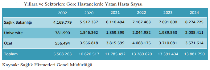 - 2024 yılında hastanelerde yatak doluluk oranı kamu hastanelerinde yüzde 62, üniversite hastanelerinde yüzde 65, özel hastanelerde ise yüzde 48,9 oldu. Tüm sektörlere göre 2024’te yatak doluluk oranı yüzde 59,8 olarak gerçekleşti.