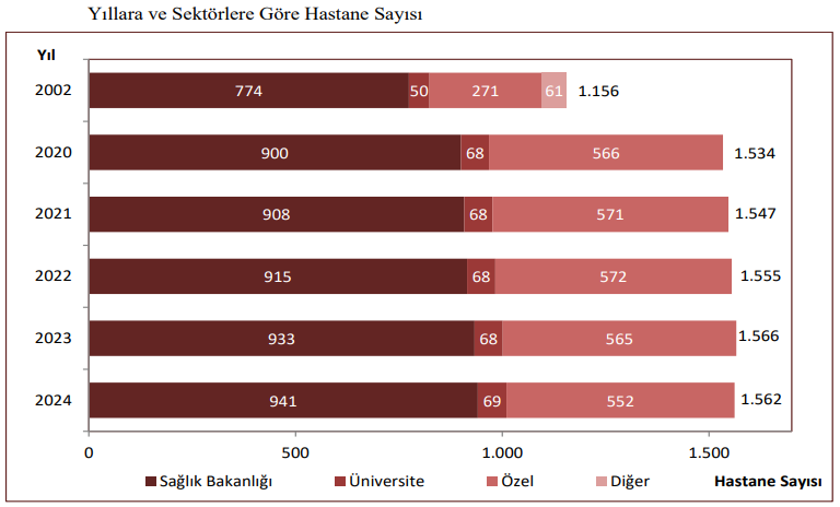 - 2024 yılında hastane sayısı 1.562 oldu. 2023 yılında hastane sayısı 1.566 adetti. 2024 yılında bir önceki yıla göre kamu hastane sayısı 8 artarak, 941 olurken; üniversite hastane sayısı 1 artarak 69’a çıktı. Özel hastane sayısı ise 2023 yılında 565 iken, 2024 yılında 552’ye geriledi.