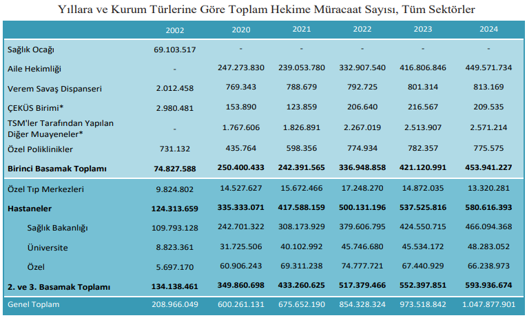 - 2024 yılında hekime müracaat sayısı 1 milyar 47 milyonu geçti. 2023 yılında bu sayı 973.5 milyondu. Buna göre 2024 yılında hekime müracaat sayısı 2024’te bir önceki yıla göre 72.3 milyon arttı. 2023’te kamu hastanelerine başvuru 424.5 milyondan 2024 yılında 466 milyona çıkarken, üniversite hastanelerine başvuru ise 45.5 milyondan 48.2 milyona yükseldi. Özel hastanelere ise 2023 yılında 67.4 milyon kişi başvururken, bu sayı 2024 yılında 66.2 milyona düştü.