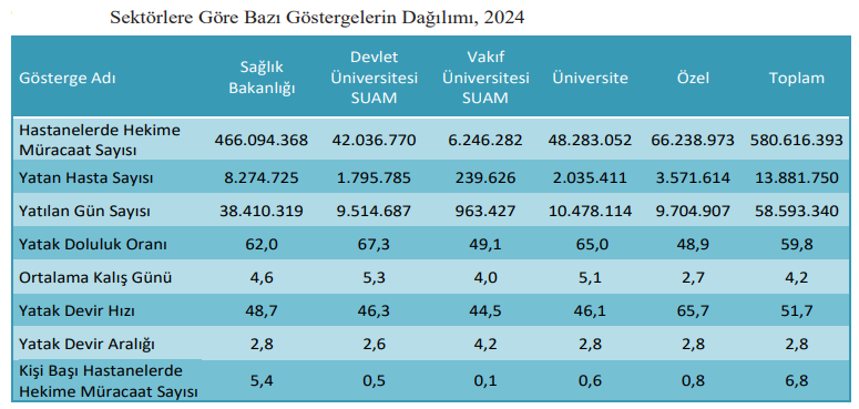 - 2024 yılında hastanelerde yatılan gün sayısına bakıldığında da 2024 yılında 58.5 milyon gün oldu. Bunun 38.4 milyonu kamu hastanelerinde, 10.4 milyonu üniversite, 9.7 milyonu da özel hastanelerde yatıldı.