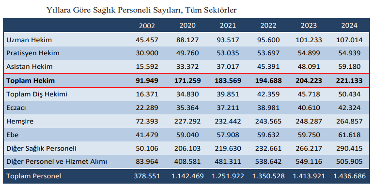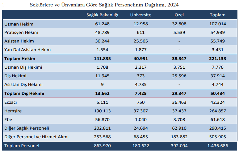 - 2024 yılında sağlık personel sayısı 1 milyon 436 bin kişi oldu. 2023 yılında bu sayı 1 milyon 413 bin kişiydi. Toplam hekim sayısı ise 2023 yılında 204 bin 223’ten, 2024 yılında 221 bin 113’e çıktı. 221.133 hekimin 141.835’i kamu hastanelerinde, 40.951’i üniversite, 38.347’si de özel hastanelerde çalışıyor. Sağlık Bakanlığında çalışan hekim sayısı 2023’te 131.762’den, 2024 yılında 141.835’e çıktı.