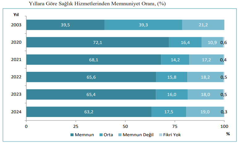 - Sağlık hizmetlerinden memnuniyet oranı ise 2024 yılında yüzde 63,2 oldu. 2023’te bu oran yüzde 65,4 olmuştu.