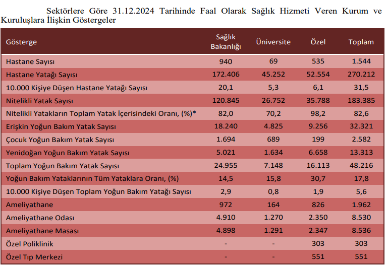 - Yoğun bakım yatak sayısı ise 2023 yılında 48.966 iken, 2024 yılında 49.010’a yükseldi. Kamu ve üniversite hastanelerinin yoğun bakım yatak sayısı artarken, özel hastanelerde 421 adet azaldı. 10 bin kişiye düşen yoğun bakım yatak sayısı 2024 yılında Türkiye genelinde 5,9 oldu.