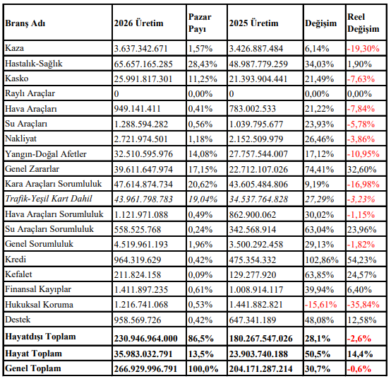 Kasko sigortalarında ise şirketler 2026’nın ilk iki ayında 25.9 milyar TL prim üreterek, geçen yılın aynı dönemine göre üretimlerini yüzde 21,49 artırdı. Kasko pazarı yılın ilk iki ayında reel olarak yüzde 7,63 küçüldü.