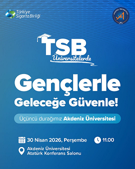 TSB ile Üniversitelerde Sigorta Buluşmaları programının 3. durağı, 30 Nisan Perşembe günü Akdeniz Üniversitesi olacak. Programa, Türkiye Sigorta Birliği (TSB) Başkanı Ahmet Yaşar, Akdeniz Üniversitesi Rektörü Özlenen Özkan da katılacak, TSB Genel Sekreteri Özgür Obalı katılacak.