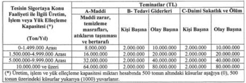 Bedeni teminatlar ise kişi başına 2 milyon TL olurken, olay başına da 10 milyon TL ile 80 milyon TL arasında değişiyor. Olay başına ise tesisin kapasitesine göre 10 milyon TL ile 80 milyon TL arasında değişiyor.